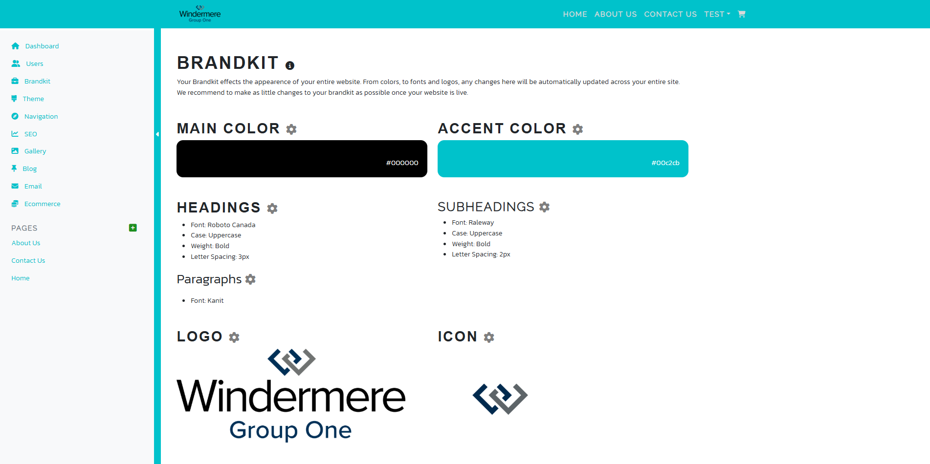The brandkit settings control the colors, fonts, font styles, and logos across the entire website.