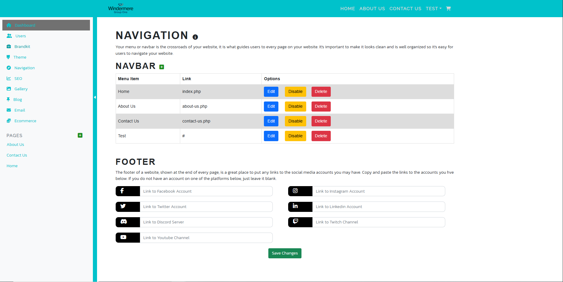 The navigation settings control the navbar and footer links. It can even handle dropdown links as well.