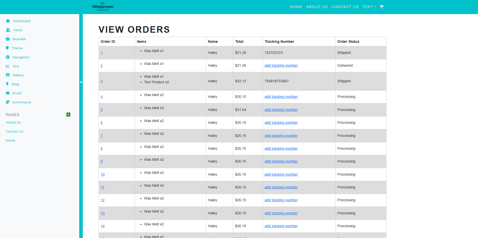 All orders are recorded here. Shipping labels can be printed from this page. Upon printing a shipping label, the order's staus will change to shipped.